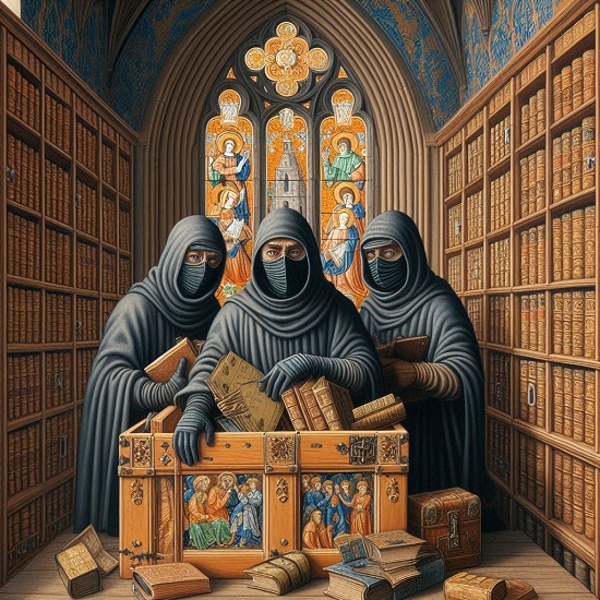 KÉP FORRÁSA UGYANITT: Az MI által készített kép: "álarcos tolvajok fosztogatják a Wimborne Minster könyvtárat középkori ikonográfiai stílus" szöveginstrukcióm alapján